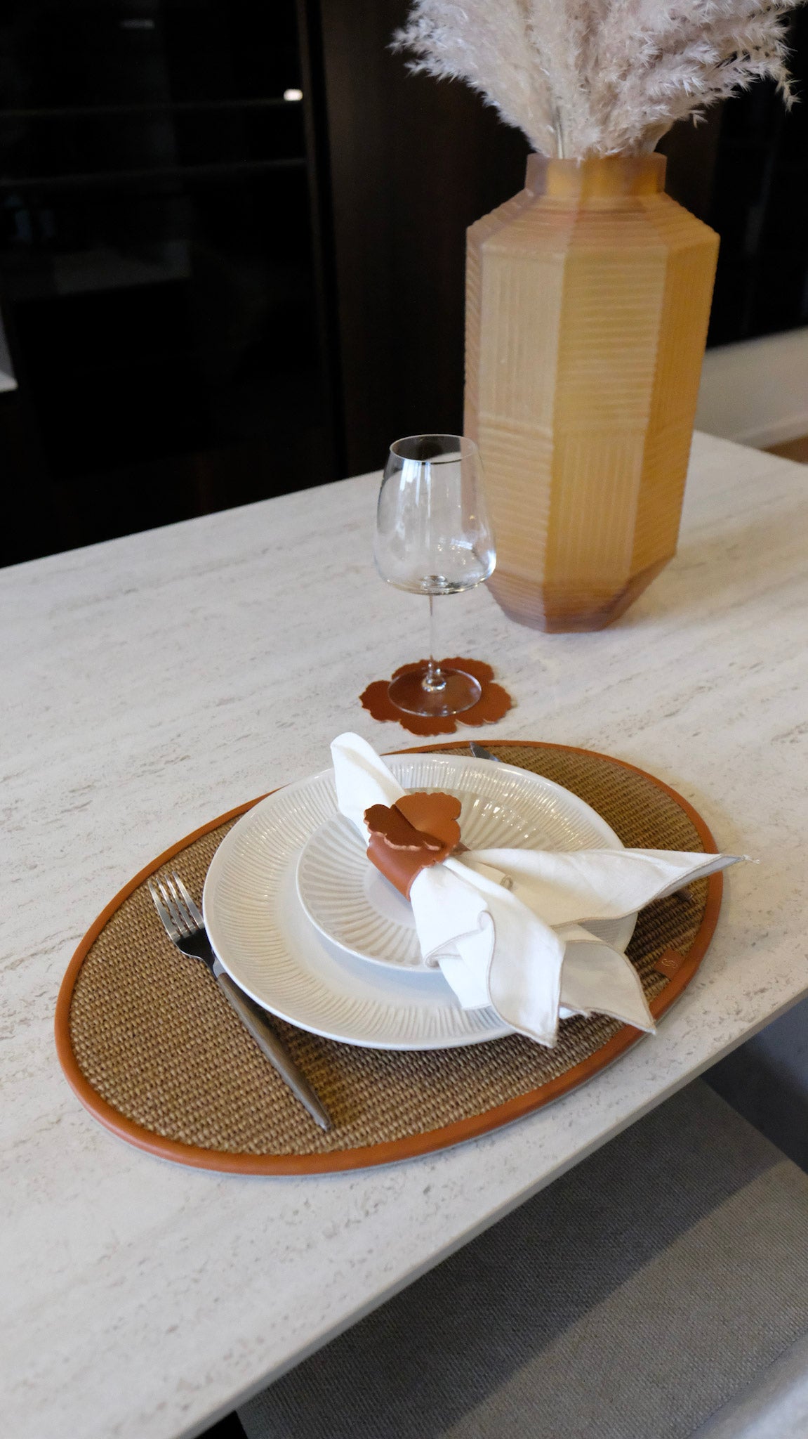 O individual Selene traz elegância à sua mesa, com a leveza da ráfia e um pormenor em pele que o torna único. Sofisticado e versátil, é perfeito para qualquer ocasião, do dia a dia a momentos especiais.